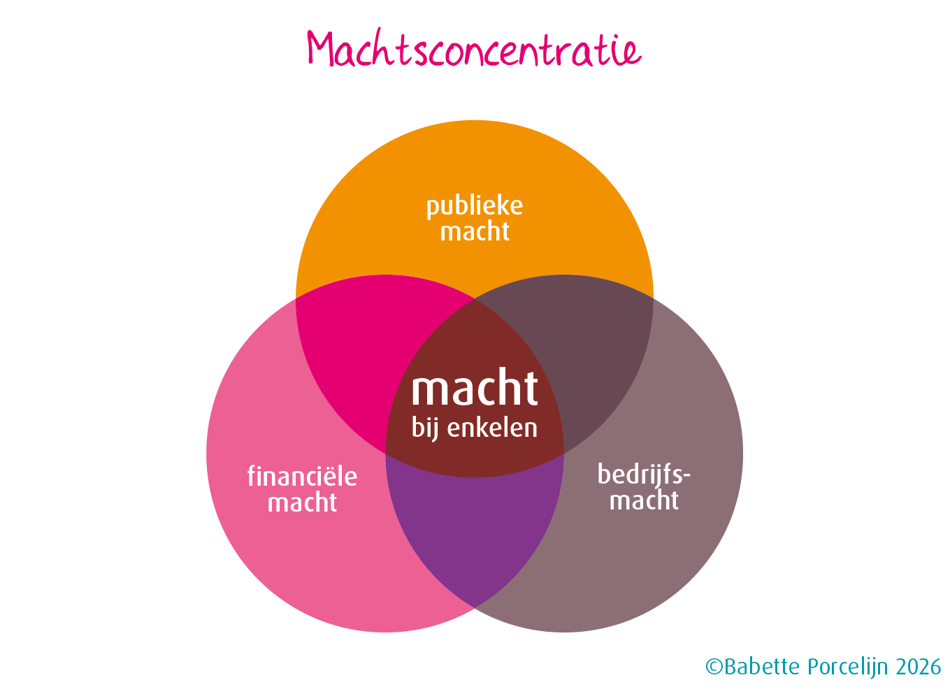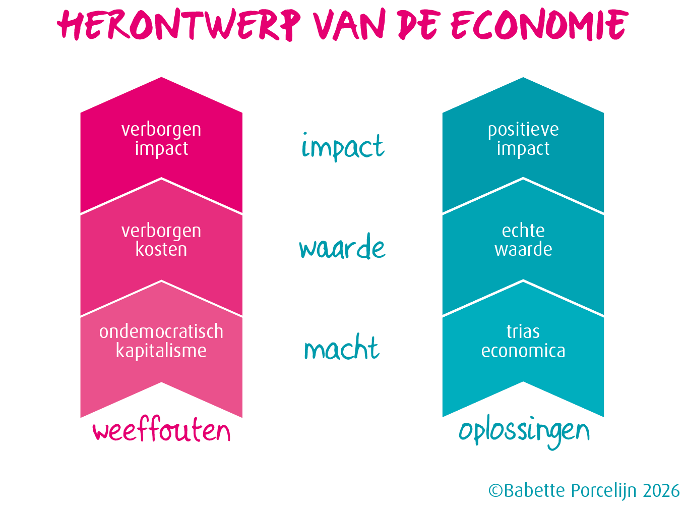In De trias economica ontwerpt Babette Porcelijn geen nieuw ‘isme’, maar nieuwe spelregels. Net zoals de trias politica ooit de macht van de koning brak, doorbreekt de Trias economica de concentratie van economische macht. De machten van de financiële sector, grote bedrijven en de overheid worden van elkaar gescheiden. Geen enkele speler mag tegelijk winst maken, beslissen over productie én de regels bepalen. De zeggenschap verschuift naar de stakeholders: iedereen die de gevolgen voelt van economische beslissingen, inclusief arbeiders in waardeketens, lokale gemeenschappen, toekomstige generaties en zelfs natuur en andere soorten.