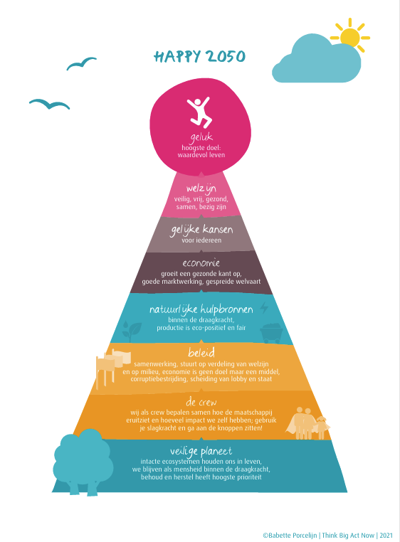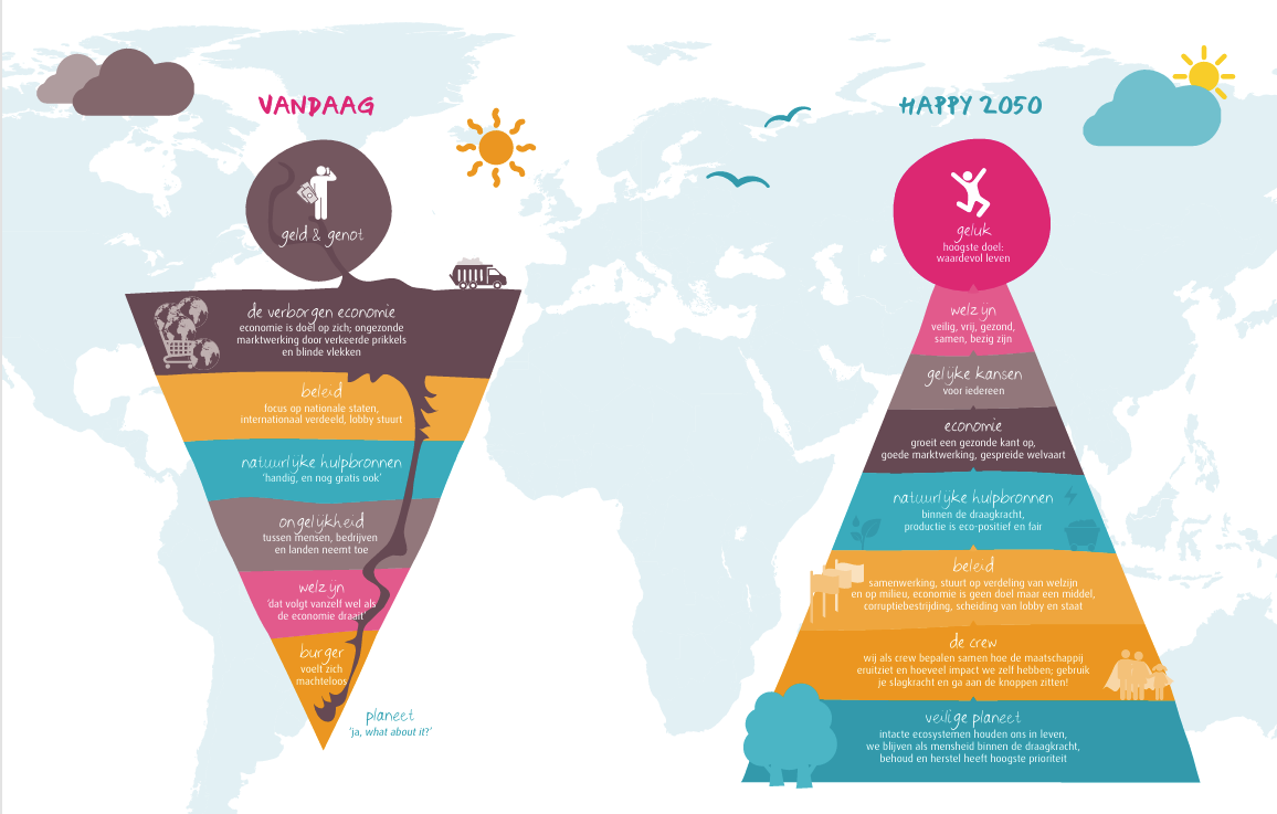 - hoe een wereld eruit kan zien waarin welzijn voor iedereen samen gaat met leven binnen de draagkracht van de aarde