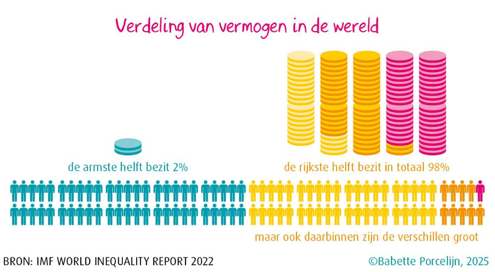De armste helft heeft maar 2% van alle bezit, dat wil zeggen dat de rijkste helft 98% heeft. En het meest bizarre: dat is OOK IN NEDERLAND zo! Ik ken best veel ongelijkheidsstatistieken, maar deze is toch weer mind boggling hoor.